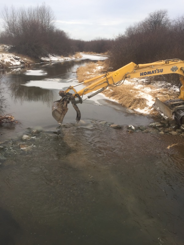 The banks on the outside edge of the stream bend (south side) were armoured against erosion both upstream and downstream of the bridge site. This was completed using rip rap and large-woody debris (LWD), which will enhance the habitat diversity of the stream and provide additional cover for fish.