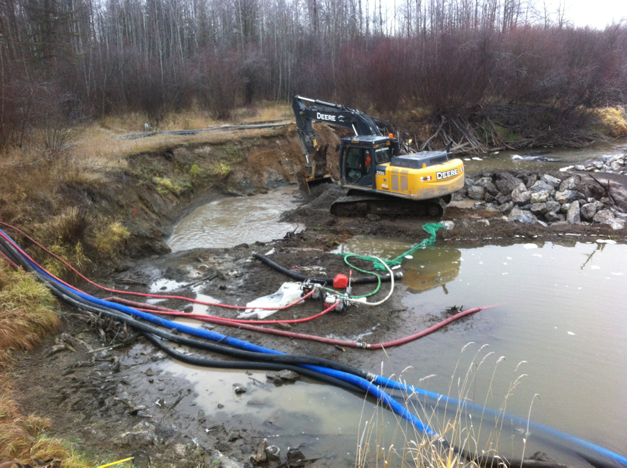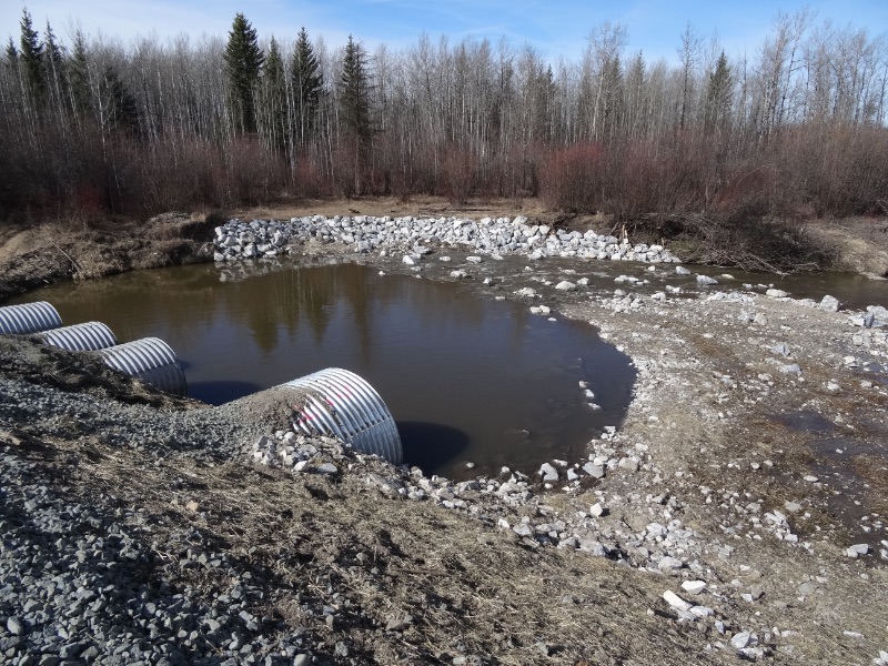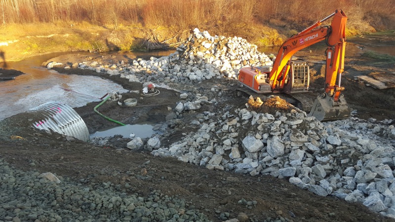 The creek was diverted to complete the project to allow for an open work area. The railway was closed for 16 hours to complete the project as the track had to be removed, along with the embankment.